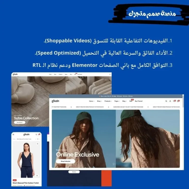 إن Glozin Theme ليس مجرد “ثيم” آخر، بل هو واجهة متكاملة تجمع بين القوة التقنية والجمال العصري. في منصة “صمم متجرك”، نرى أن هذا القالب يمثل قفزة نوعية في تصميم المواقع التجارية، خاصة مع ميزة الفيديوهات التفاعلية التي ستكون التريند السائد في السنوات القادمة.